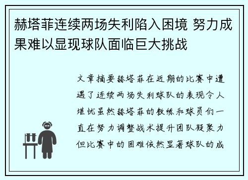 文章摘要:赫塔菲在近期的比赛中遭遇了连续...