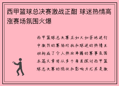 西甲篮球总决赛正如火如荼地进行中,激烈的...