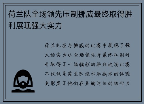 荷兰队在与挪威的比赛中展现了强大的实力,...