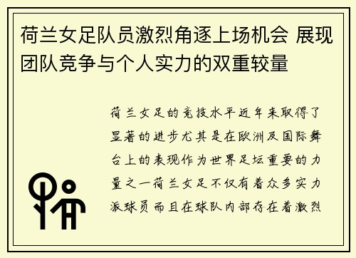 荷兰女足的竞技水平近年来取得了显著的进步...