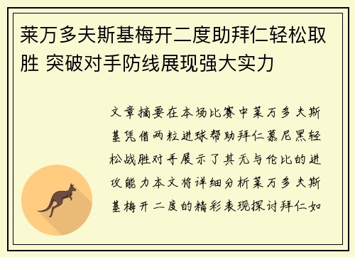文章摘要:在本场比赛中,莱万多夫斯基凭借...