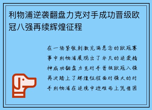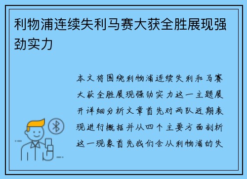 本文将围绕利物浦连续失利和马赛大获全胜展...
