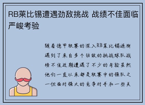 随着德甲联赛的深入,RB莱比锡逐渐遇到了...