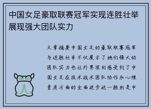 文章摘要:中国女足的豪取联赛冠军与连胜壮...