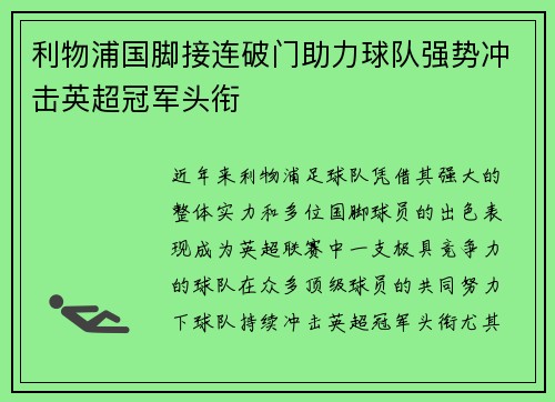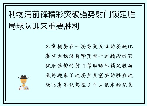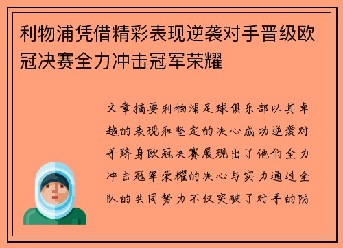 文章摘要:利物浦足球俱乐部以其卓越的表现...