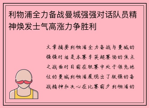 文章摘要:利物浦全力备战与曼城的强强对话...