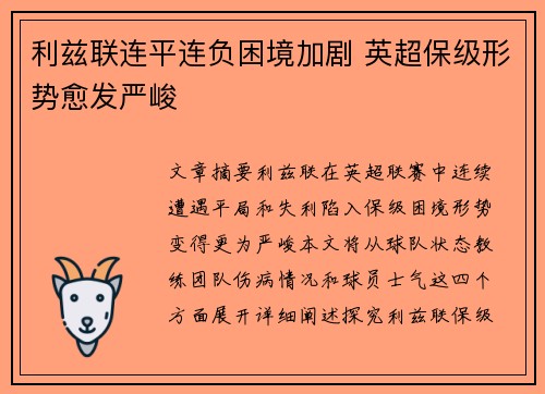 文章摘要: 利兹联在英超联赛中连续遭遇平...