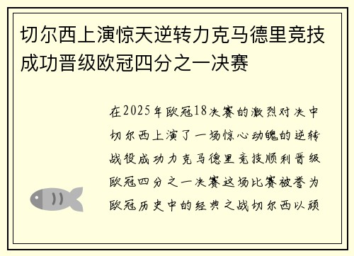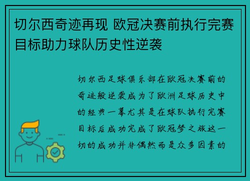 切尔西足球俱乐部在欧冠决赛前的奇迹般逆袭...