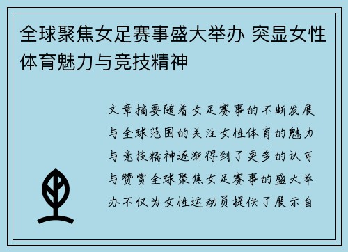 文章摘要:随着女足赛事的不断发展与全球范...