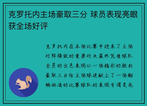 克罗托内在本场比赛中迎来了主场对阵强敌的...