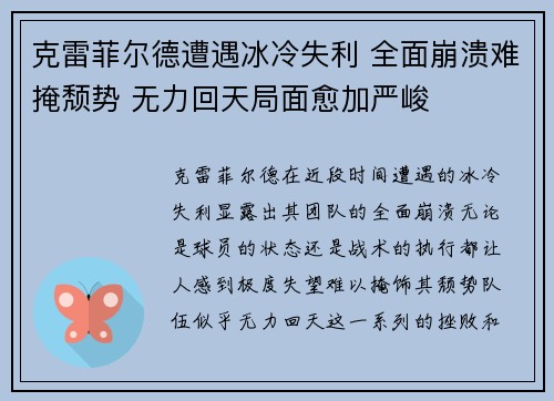 克雷菲尔德在近段时间遭遇的冰冷失利,显露...