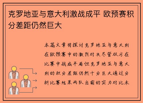 本篇文章将探讨克罗地亚与意大利在欧预赛中...