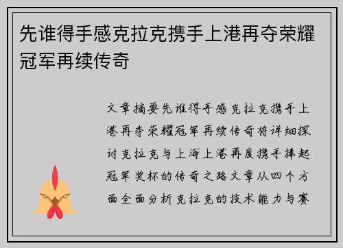 文章摘要: 《先谁得手感克拉克携手上港再...