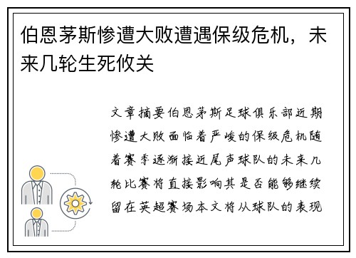 文章摘要:伯恩茅斯足球俱乐部近期惨遭大败...