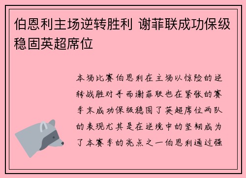 本场比赛,伯恩利在主场以惊险的逆转战胜对...