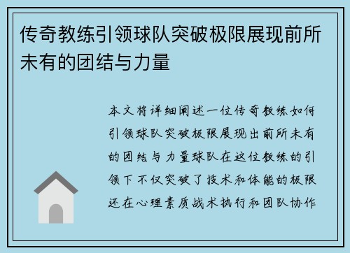 本文将详细阐述一位传奇教练如何引领球队突...