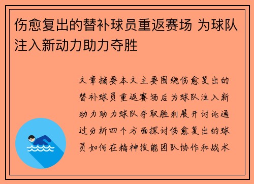 文章摘要:本文主要围绕伤愈复出的替补球员...