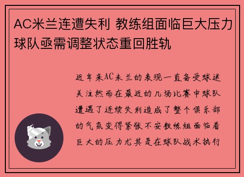 近年来,AC米兰一直在努力摆脱低迷的状态...